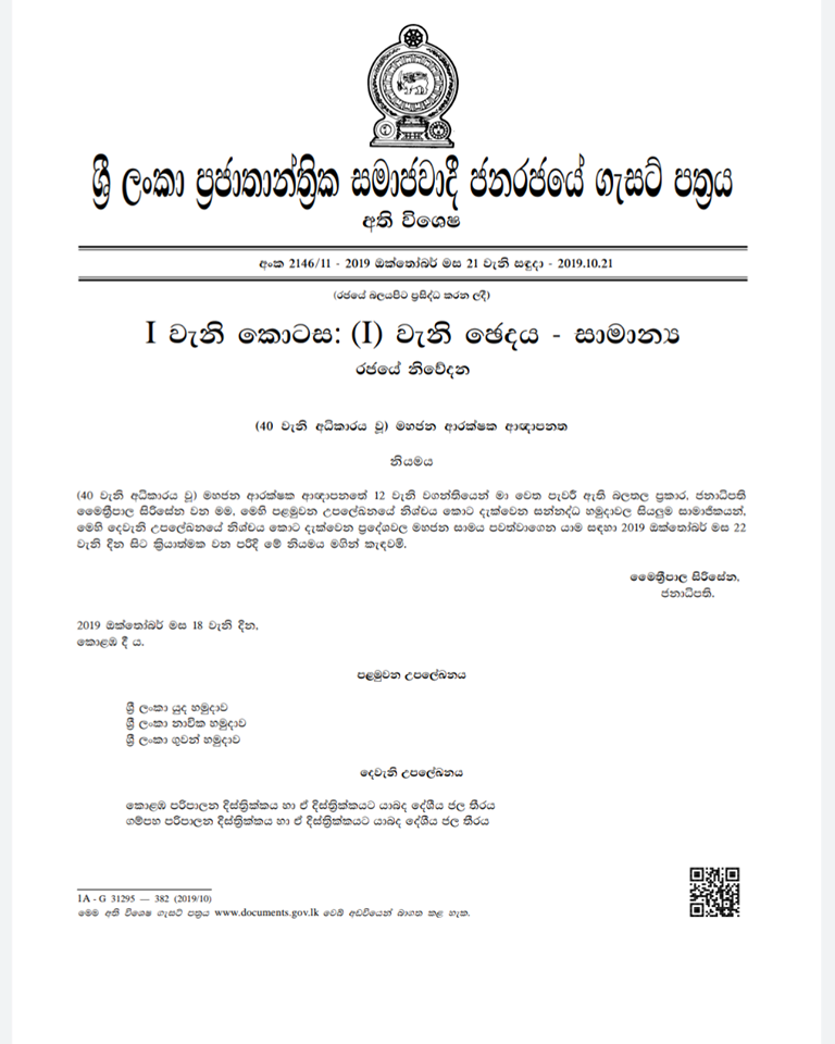 ජනාධිපති මෛත්රීපාල සිරිසේන මහතා විසින් ඊයේ දිනයේ සිට බලපැවැත්වෙන පරිදි අති විශේෂ ගැසට් නිවේදනයක් නිකුත් කර තිබෙනවා. ඒ මහජන සාමය පවත්වාගෙන යෑම සහතික කිරීමේ අරමුණෙන් ත්රිවිධ හමුදාව ඇතුළු සියළු ආරක්ෂක අංශ සාමාජිකයින් යෙදවීමට අදාලවයි.