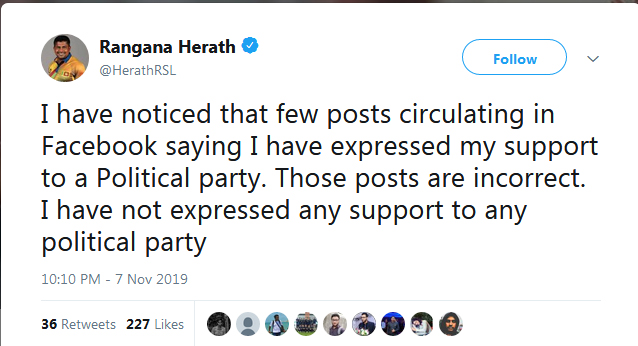 තමන් යම්කිසි දේශපාලන පක්ෂයට සහාය දීමට තීරණය කර ඇති බවට ෆේස්බුක් සමාජ ජාලය ඔස්සේ හුවමාරුවන පෝස්ටුවල සත්‍යතාවක් නොමැති බව ශ්‍රී ලංකා හිටපු ටෙස්ට් නායක රංගන හේරත් පවසනවා.