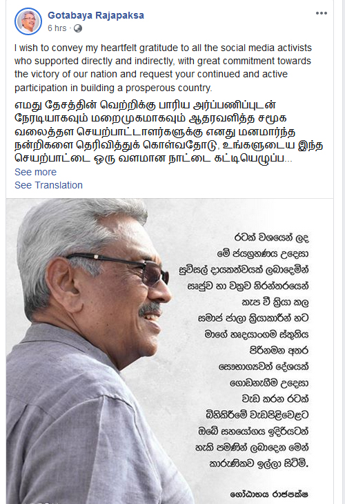 තමාගේ ජයග්රහණයට සමාජ මාධ්ය, සෘජුව හා වක්රව සුවිශේෂී දායක්ත්වයක් දැක්වූ බව ජනාධිපති ගෝඨාභය රාජපක්ෂ මහතා සදහන් කළා.