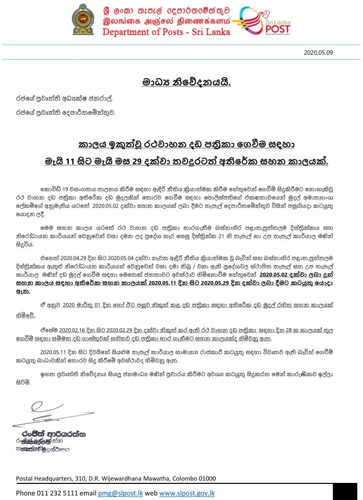 අතිරේක දඩ මුදලකින් තොරව මෙම දඩ පති‍්‍රකා ගෙවීම සදහා පොලිස්පතිවරයාගේ එකගතාවයෙන් මුදල් අමාත්‍යංශ ලේඛම්වරයාගේ අනුමැතිය යටතේ මෙම සහන කාලය ලබා දීමට සැළසුම් කර ඇති බව සදහන්.