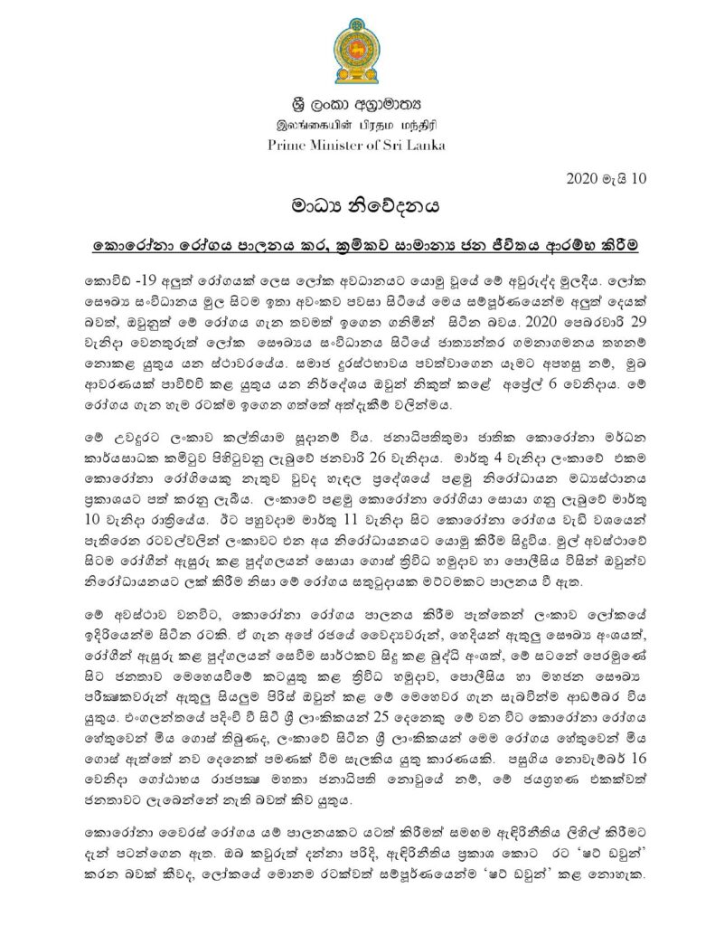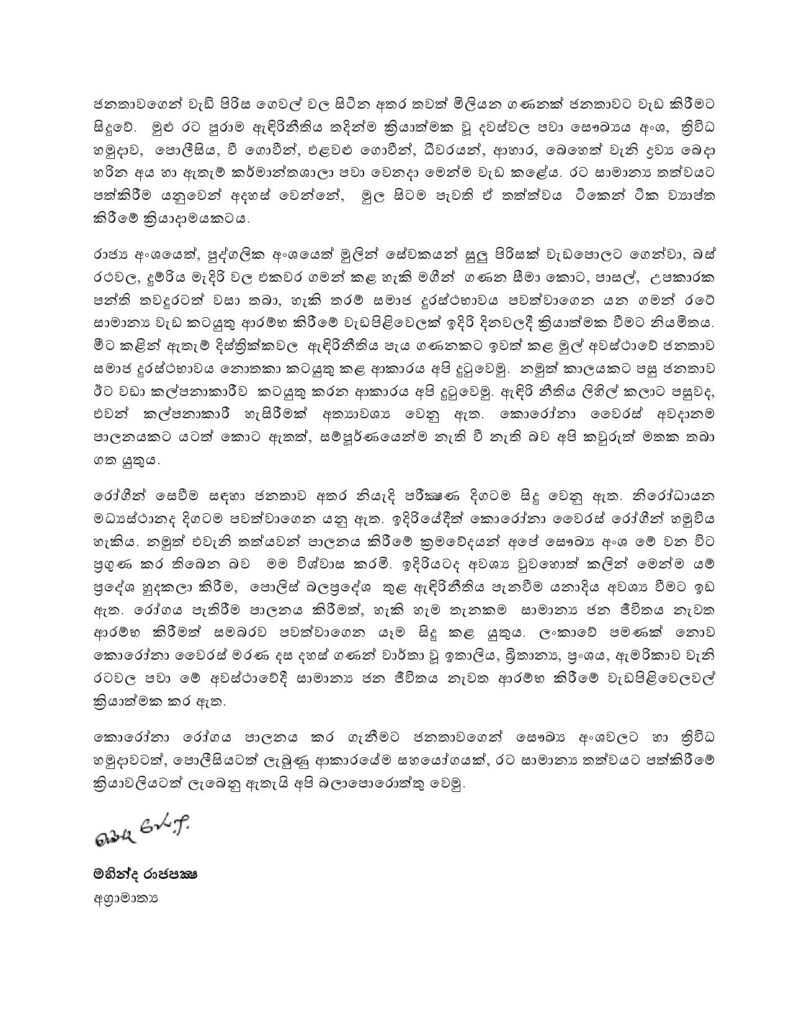 හෙට සිට ජන ජීවිතය සාමාන්‍ය තත්ත්වයට පත් කිරීම සම්බන්ධයෙන් අග‍්‍රාමාත්‍ය මහින්ද රාජපක්‍ෂ මහතා නිවේදනයක් නිකුත් කර තිබෙනවා.