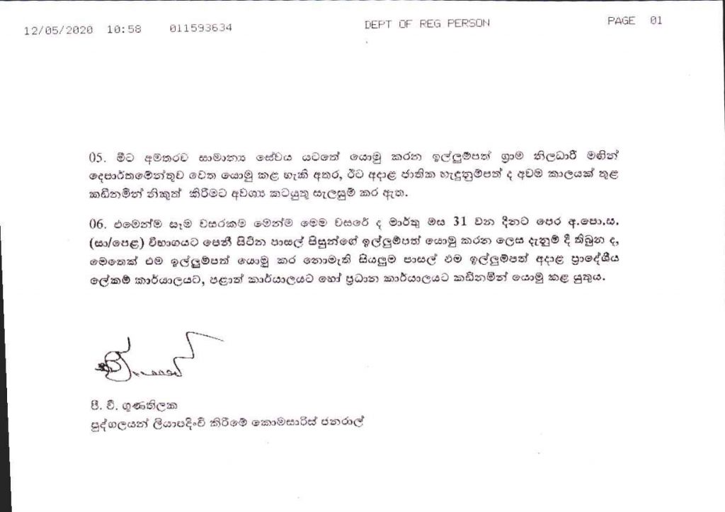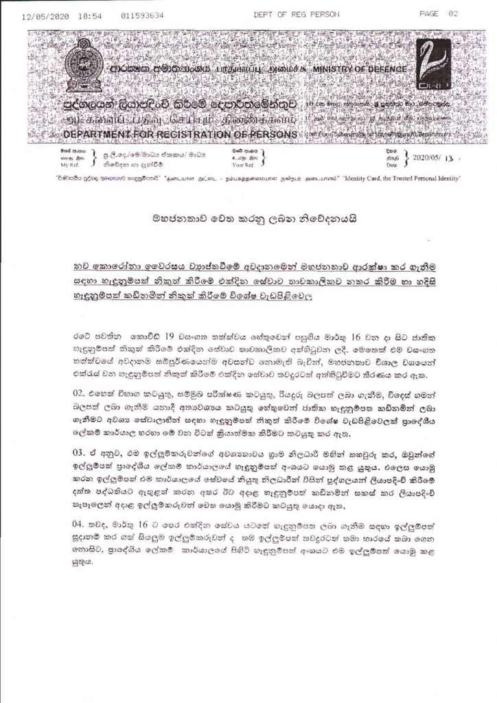 කෙසේ වෙතත් අත්‍යවශ්‍ය කටයුතු හේතුවෙන් ජාතික හැදුනුම්පත් කඩිනමින් ලබාගැනීමට අවශ්‍ය පුද්ගලයන් වෙනුවෙන් විශේෂ වැඩපිළිවෙලක් ප‍්‍රාදේශීය ලේඛම් කාර්යාල හරහා මේ වන විටත් කි‍්‍රයාත්මකයි.