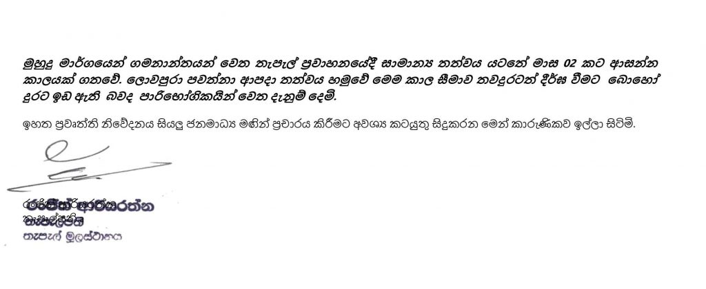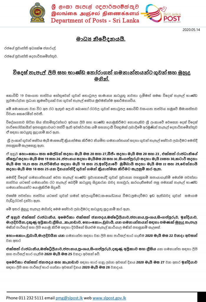 ශී්ර ලංකාවේ සිට විදෙස් තැපැල් ලිපි සහ භාණ්ඩ තෝරාගත් ගමනාන්තයන්ට ගුවන් මගින් සහ මුහුදු මාර්ගයෙන් රැගෙන යාමට තැපැල් දෙපාර්තමේන්තුව සැලසුම් කර තිබෙනවා.
