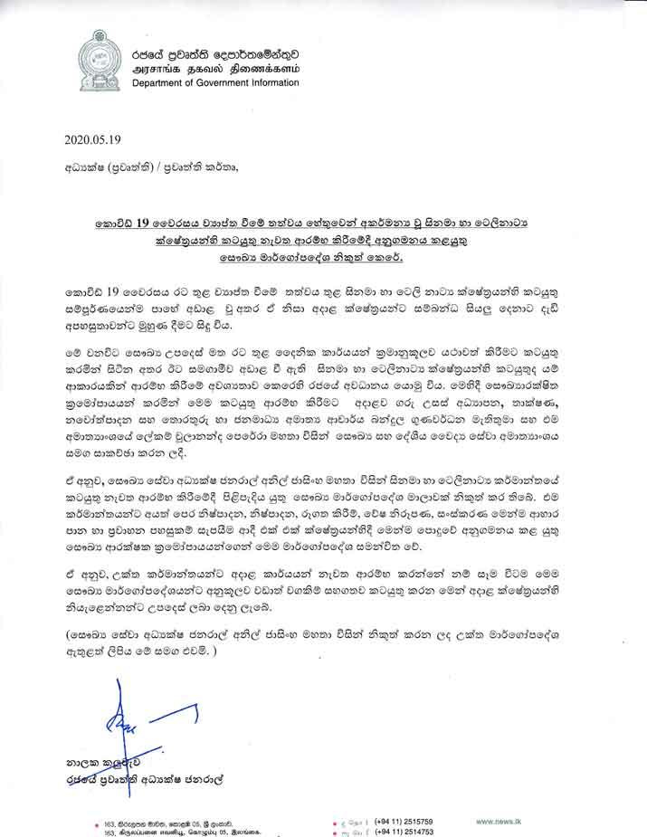 කොවිඩ් 19 හේතුවෙන් අඩාල වූ සිනමා හා ටෙලි නාට්‍ය ක්ෂේත්‍රයේ කටයුතු නැවත ආරම්භ කිරීමට අදාළ මාර්ගෝපදේශ සෞඛ්‍ය සේවා අධ්‍යක්ෂ ජනරාල් විශේෂඥ වෛද්‍ය අනිල් ජාසිංහ මහතා නිකුත් කර තිබෙනවා. මෙම කර්මාන්යට අයත් පෙර නිෂ්පාදන, නිෂ්පාදන, රූගත කිරීම්, වේෂ නිරූපන, සංස්කරණ මෙන්ම ආහාර පාන හා ප්‍රවාහන පහසුකම් සැපයීම ආදී එක් එක් ක්ෂේත්‍රයන්හිදී මෙන්ම පොදුවේ අනුගමනය කළ යුතු සෞඛ්‍ය ආරක්ෂිත ක්‍රමෝපායන්ගෙන් මෙම මාර්ගෝපදේශ සමන්විත වෙනවා. ඊට අදාළ යොමුව පහතින්