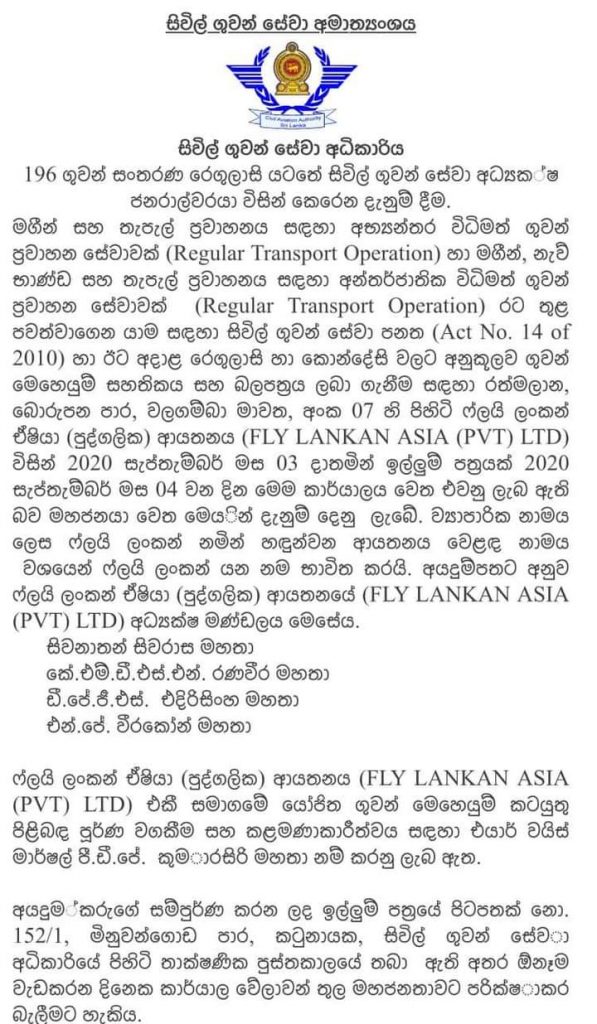 ශ්රී ලංකාවේ ක්රියාත්මක වීමට නියමිත නවතම ගුවන් සේවය වන FLY LANKAN ගුවන සේවය පිලිබදව සිවිල් ගුවන් සේවා අමාත්යංශය විසින් නිවේදනයක් නිකුත් කර තිබෙනවා.