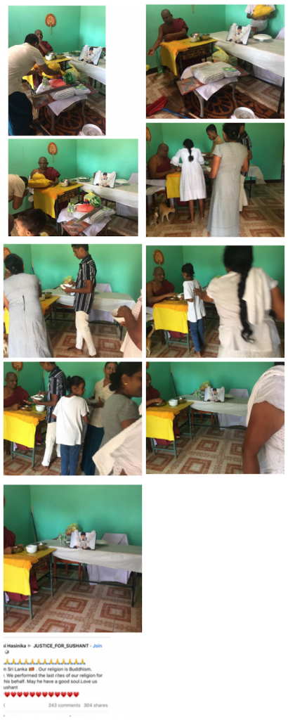 ඉන්දීය සුපිරි නළු සුෂාන්ත් සිං රාජ්පුත් මිය ගොස් අදට මාස 03 ක් ගත වන අතර ඔහුගේ තෙමස් පුර්ණය සිහි ගන්වමින් ශ්රී ලංකික රසිකාවියක් ඇයගේ පවුලේ පිරිස සමග සාංඝික දානයක් සංවිධානය කර තිබුණ පුවතක් වාර්තා වුණා.