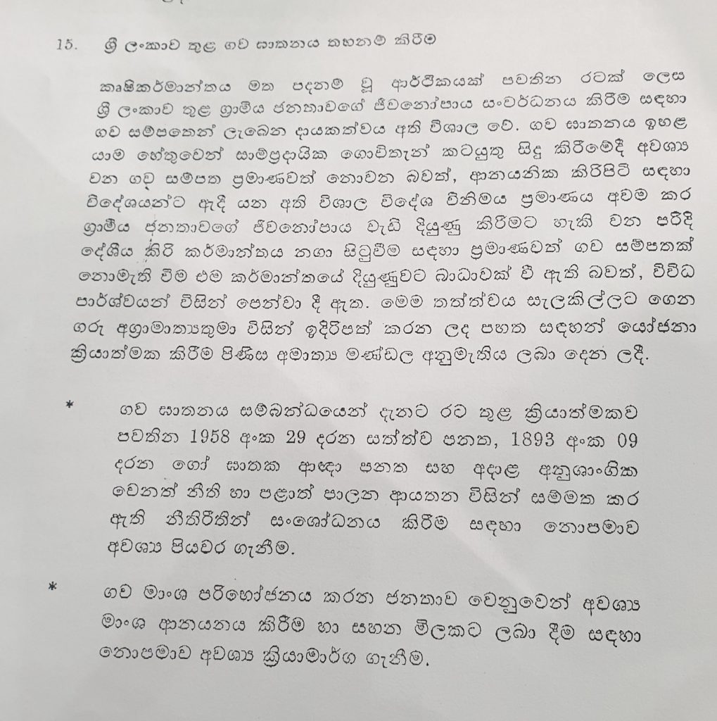 ශ්රී ලංකාව තුළ ගව ඝාතනය තහනම් කිරී අදාල කැබිනට් පත්රිකාව ඉදිරිපත් කර තිබෙනවා.