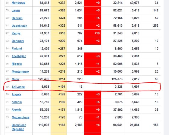 ලොව පුරා කොරෝනා ආසාදිතයින් හමුවීම පිලිබදව නිකුත් කර තිබෙන වාර්තාවට අනුව ශ්‍රී ලංකාව මේ වන විට 79 වන ස්ථානයේ පසුවනවා.