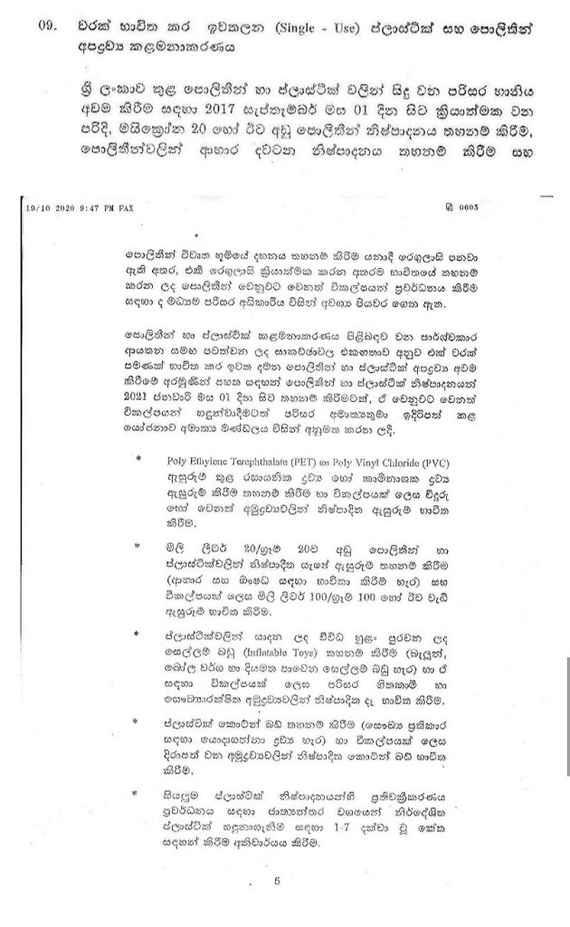 මේ අනුව වෙළෙදපොලේ තිබෙන වරක් භාවිත කර ඉවතලන ප්ලාස්ටික් සහ පොලිතීන් අපද්‍රව්‍ය කළමනාකරණයට කැබිනට් අනුමැතිය- 2021 වර්ෂයේ සිට සිට විකල්ප හඳුන්වා දෙනු ලබනවා.