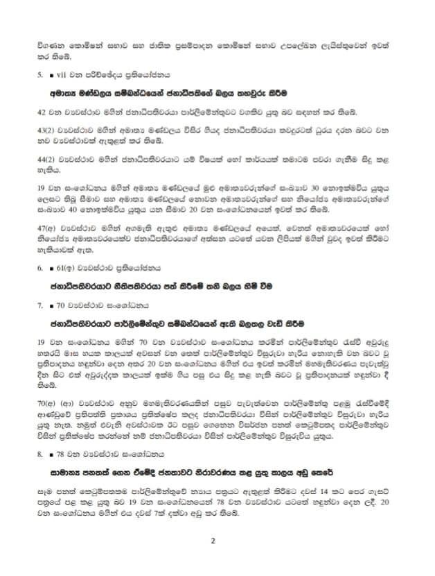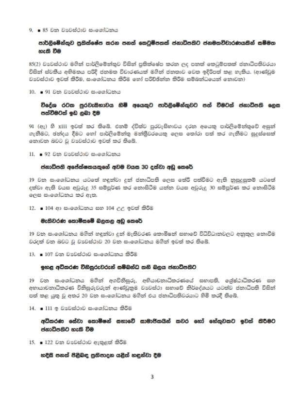 ඒ අනුව ජනාධිපතිවරයා ඉල්ලුම් කරන ජන වරමේ වාර ගණන සීමා කිරීම, ජනාධිපතිවරයා ආණ්ඩුක්‍රම ව්‍යවස්ථාව අනුගමනය කිරීමේ වගකීම ඉවත් කිරීම, ජනාධිපතිවරයාට එරෙහිව නඩු පැවරීමේ ඉඩකඩ සීමා කිරීම, මැතිවරණ කොමිසමේ බලතල අඩු කිරීම ඇතුළු වෙනස්කම් 20ක් ඊට ඇතුළත්.