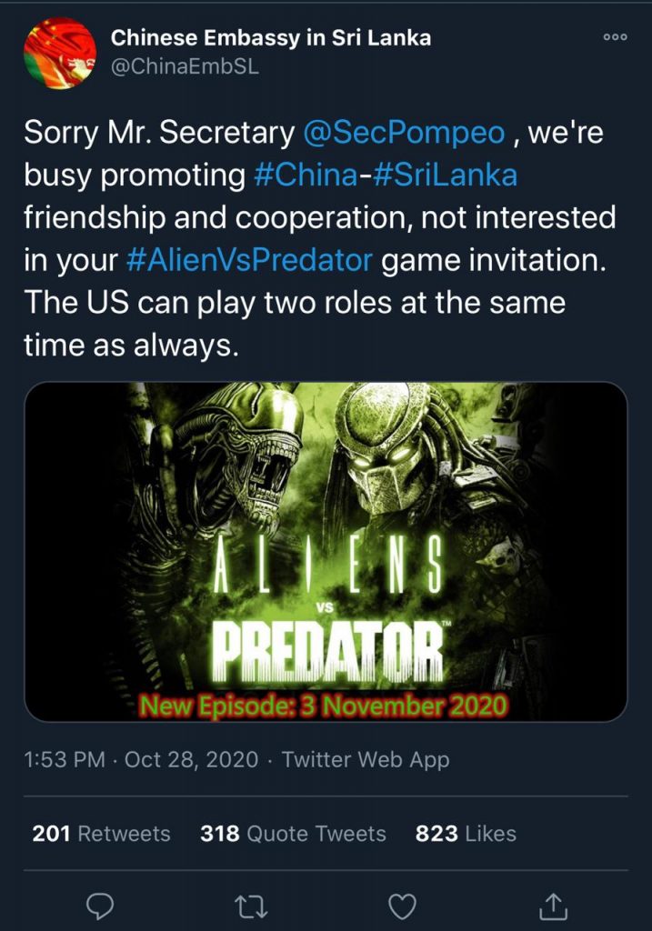 ඊට ප්‍රතිචාර දක්වමින් චීන තානාපති කාර්යාලය සිය ට්විටර් ගිණුමෙහි සඳහන් කර තිබුණේ, චීනය සහ ශ්‍රී ලංකාව අතර මිත්‍රත්වය සහ සහයෝගීතාව ප්‍රවර්ධනය කිරීමේ කටයුතුවල නියැලී සිටින හෙයින් චීනය කාර්යබහුල වී සිටින බවයි.
