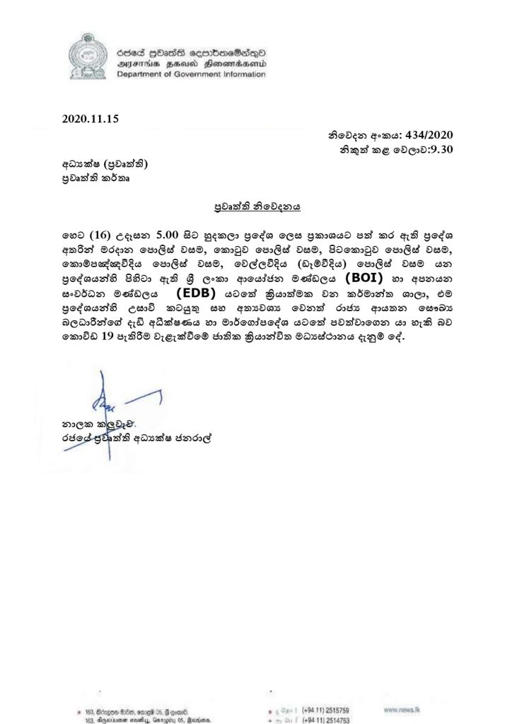 කොවිඩි 19 පැතිරිම වැළැක්විමේ ජාතික ක්රියාන්විත මධ්යස්ථානය විසින් හුදකලා කළ ප්රදේශවල BOI සහ EDB කර්මාන්ත ශාලා වෙත දැනුම් දීමක් කර තිබේ.