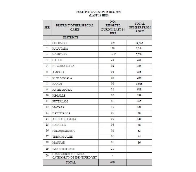 ඊයේ දිනය තුල මෙරටින් නව කොරෝනා වෛරසය ආසාදනය වූ පුද්ගලයින් 688 දෙනකු හදුනා ගත් අතර එයින් වැඩිම ආසාදිතයින් වාර්තා වී ඇත්තේ කොළඹ දිස්ත්‍රික්කයෙන්. එම ගණන 309ක්.