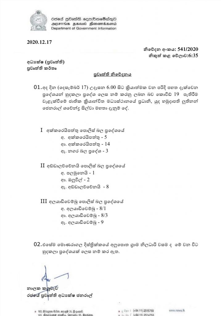 අද උදෑසන 6.00 සිට අක්කරෙයිපත්තු පොලිස් බලප්‍රදේශයේ ප්‍රදේශ කිහිපයක් සහ මොණරාගල දිස්ත්‍රික්කයේ ග්‍රාම නිලධාරී වසමක් හුදකලා කිරීමට තීරණය කළ බව යුද හමුදාපති ලුතිනන් ජෙනරාල් ශවේන්ද්‍ර සිල්වා මහතා සදහන් කරනවා.