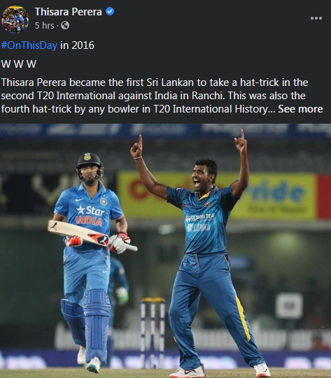 ශ්‍රී ලංකා කණ්ඩායම වෙනුවෙන් ජාත්‍යන්තර විස්සයි විස්ස ක්‍රිකට් පිටියේ පිට පිට කඩුලු ත්‍රිත්වයක් ලබාගෙන අදට වසර 05 ක් ගතව ඇති බව ඔහු සිය Face book ගිණුමේ සටහනක් තබමින් සදහන් කර තිබෙනවා.