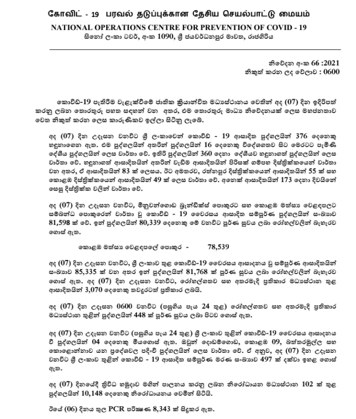 අද දිනට කොරෝනා තත්ත්ව වාර්තාව