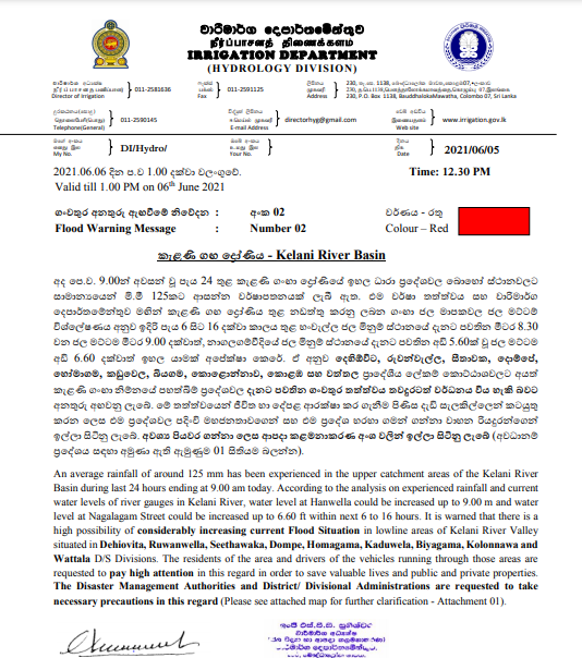 කැළණි  ගංගා  නිම්නයේ පහත් බිම් වල ගංවතුර තත්වය වර්ධනය විය හැකි බවට අනතුරු ඇගවීමේ නිවේදනයක්