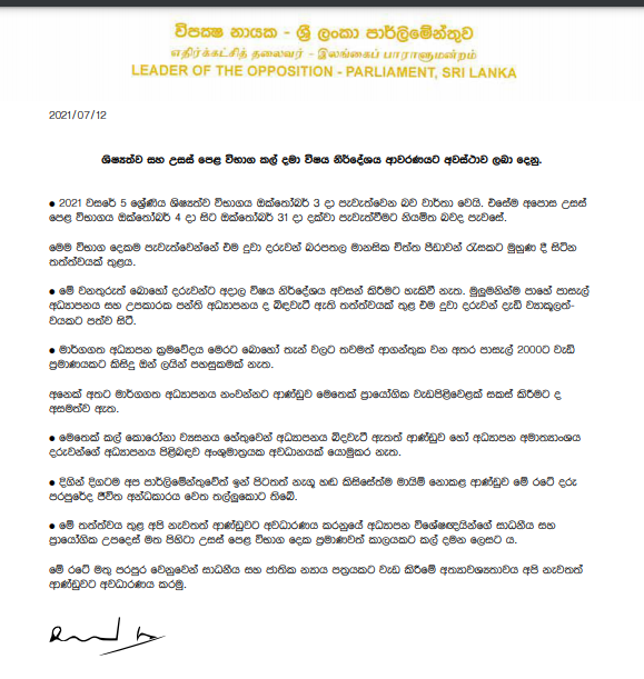 ශිෂ්‍යත්වය සහ පැවැත්වීමට නියමිත උසස් පෙළ විභාග කල් දමා විෂය නිර්දේශය ආවරණයට අවස්ථාව ලබාදෙන ලෙස විපක්ෂනායක සජිත් ප්‍රේමදාස මහතා රජයෙන් ඉල්ලා සිටිනවා.
