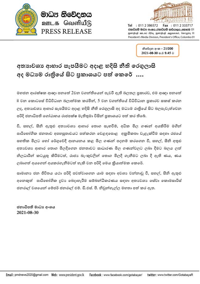 ජනතාවගේ සාමාන්ය ජන ජීවිතය පවත්වාගෙන යෑම සදහා අවශ්ය වන වී, සහල් සහ සීනි ඇතුළු අනෙකුත් පාරිභෝගික ද්රව්ය බෙදාහැරීම සම්බන්ධීකරණය සඳහා අත්යවශ්ය සේවා කොමසාරිස් ජනරාල් ලෙස මේජර් ජෙනරාල් එම්. එස්. පී නිවුන්හැල්ල මහතා පත්කර තිබෙනවා.