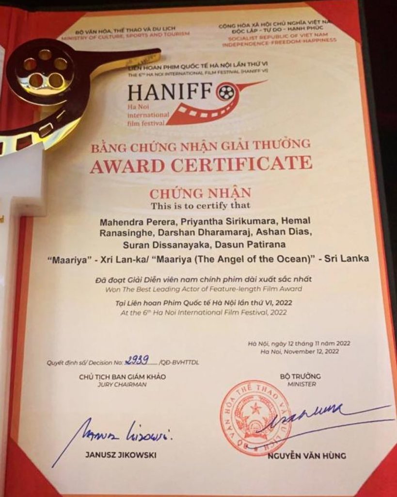 මාරියා චිත්‍රපටයේ සමස්ත නළුවන් සදහාම “හොදම නළුවා” සම්මානය ලැබීම, මා ජීවිතයේ ලද විරල ජයග්‍රහණයක් ලෙස ඉතාමත් ගෞරවයෙන් සලකමි.