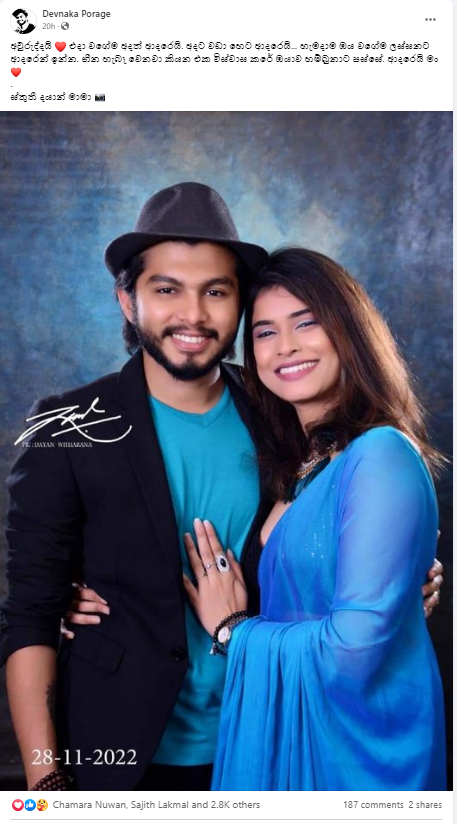 “අවුරුද්දයි ❤️ එදා වගේම අදත් ආදරෙයි. අදට වඩා හෙට ආදරෙයි… හැමදාම ඔය වගේම ලස්සනට ආදරෙන් ඉන්න. හීන හැබෑ වෙනවා කියන එක විස්වාස කරේ ඔයාව හම්බුනාට පස්සේ. ආදරෙයි මං ❤️”
