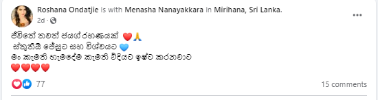 සමාජ මාධ්‍ය තුලත් ඇය එක ලෙසම ජනප්‍රිය චරිතයක්.පසුගිය දිනක සමාජ මාධ්‍යයේ සැරිසරන අපට ඈ තැබූ වෙනස්ම ආකාරයේ සටහනක් නෙත ගැටුණා. ඒ සතුටු හිතෙන ආරංචියක් වූවත් ඈ ඒ කුමක්දැයි සදහන් කර තිබුණේ නෑ