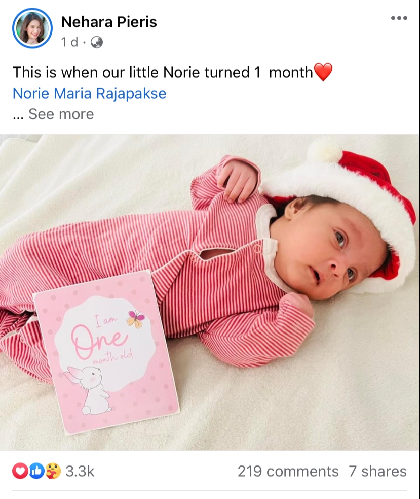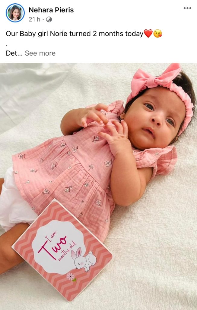 පුංචි දියණියට මාසයක් පිරුණු ලස්සන කතාව ලස්සන ඡායාරූප සමගම නෙහාරා සමාජ මාධ්යයේ පලකර තිබුණා.