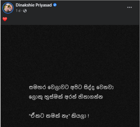 දිනක්ෂි ප්රියසාද් එලෙස පෝස්ට් එකක් පලකර තිබුණා..ඇය මෙලෙස ලපකර පෝස්ටුවට ඉහළ ප්රතිචාර රැසක් හිමිවී තිබුණා..