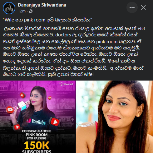 ඔහුගේ බිරිද ජනප්රිය යූටියුබ් තාරකාවක්. ඒ ගැනත් ධනංජය මෙහි සදහන් කර තිබුණා .