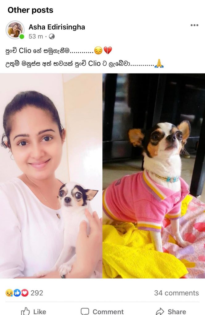 ආශා වැඩියෙන්ම ආදරය කරන කෙනෙක් අද මේ ලෝකෙන් සමු අරගෙන. ඒ ඇගේ සුරතල් බලු පැටියා Clio. පුංචි Clio ගේ සමුගැනීමත් එක්ක ආශා ඇගේ සමාජ මාධ්ය වල සටහනක් පල කර තිබුණා .