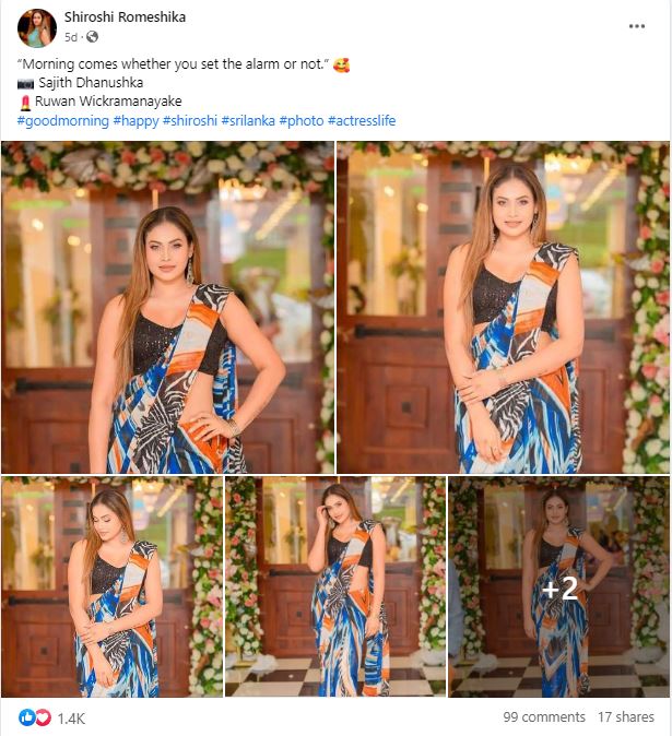 ඇය මෑතකදී සරාගී සාරි විලාසිවකින් සැරසී සිටින ඡායාරූ කිහිපයක් සමාජ මාධ්යයේ පළ කර තිබුණේ අපූරු සටහක් සමග