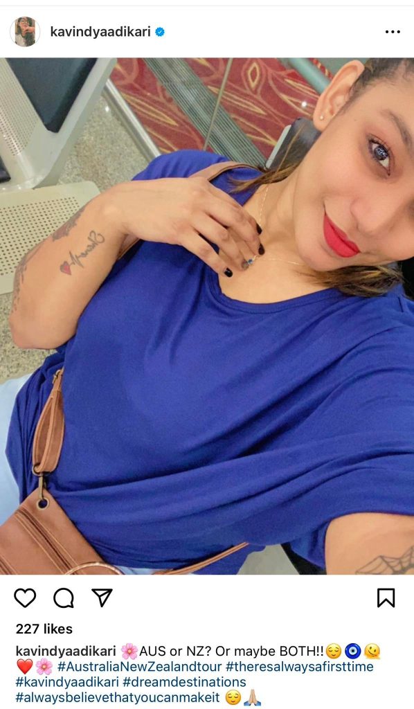 කවින්ද්‍යා පසුගියදා විදෙස්ගත වුණා. ඇය ගුවන්තොටුපොළේ සිටි ලබාගත් ඡායාරූපයක් සමාජ මාධ්‍යයට එක් කරමින් සටහන් කර තිබුණේ ඇය ඕස්ට්‍රේලියාවට හා නවසීලන්තයට යන බවත් ඇය එහි යන්නේ ප්‍රථම වරට බවත් වේ.