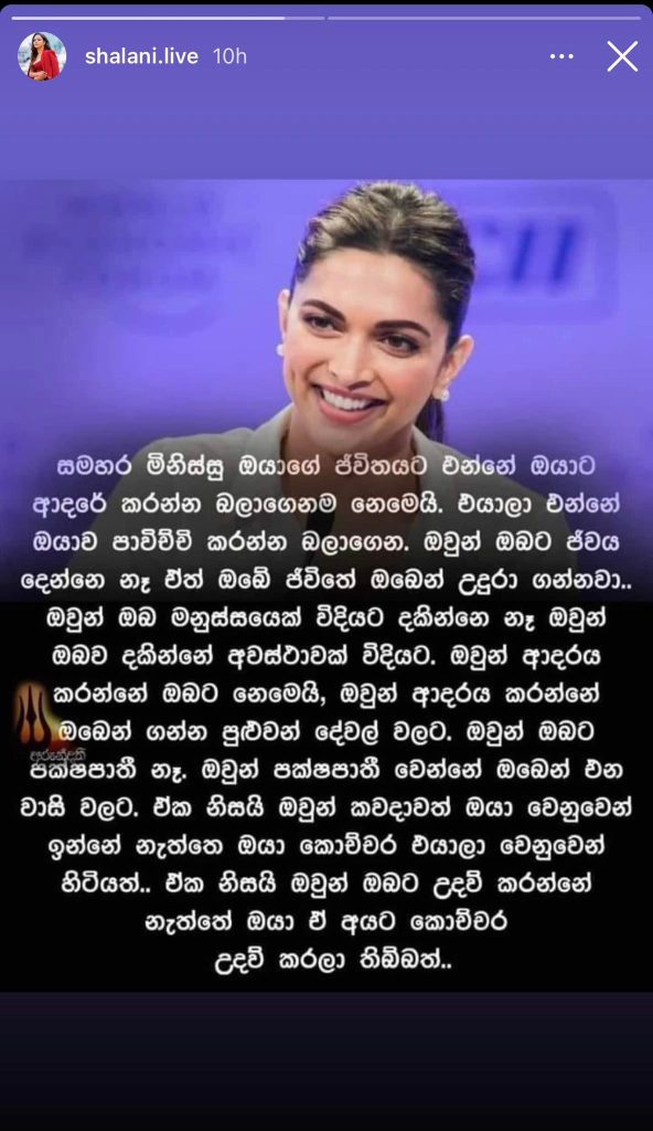 ශලනි පසුගිය දිනක ඉන්ස්ට්රාග්රෑම් ස්ටෝරීස් ලෙස අපුරු සටහනක් පල කර තිබුණා.