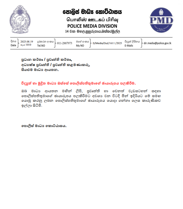 විද්යුත් හා මුද්රිත මාධ්ය ඔස්සේ මාධ්ය ආයනතන මගින් නිකුත් කරනු ලබන ලිපි, ප්රවෘත්ති හා වෙනත් වැඩසටහන් සඳහා පොලිස්පතිතුමාගේ ඡායාරූප පළ කිරීමට අවශ්ය වන අවස්ථාවන් වලදී දී පහත දී ඇති ඡායාරූපය භාවිතා කරන ලෙසට පොලිස් මාධ්ය කොට්ඨාසය ඉල්ලීමක් කොට තිබෙනවා.