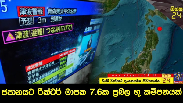 ඊයේ(08) ජපානයේ උතුරු කෙළවරේ පිහිටි අමෝරි නගරයට නැගෙනහිරින් සහ හොක්කයිඩෝ දූපතට දකුණින් රික්ටර් මාපකයේ 7.6ක ප්රබලත්වයෙන් යුත් භූ කම්පනයක් හට ගැනීම හේතුවෙන් මේ වනවිට පුද්ගලයින් කිහිපදෙනෙකු තුවාල ලබා ඇති බව විදෙස් මාධ්ය වාර්තා කර තිබෙනවා. මෙම භූ කම්පනය හේතුවෙන් සුනාමි අනතුරු ඇඟවීමක් නිකුත් කෙරුණු අතර, එහි ප්රතිඵලයක් ලෙස හොක්කයිඩෝ ප්රාන්තයේ උරකාවා නගරයට සහ මුට්සු ඔගවාරා හි අමෝරි ප්රාන්ත වරායන් වෙත සෙන්ටිමීටර 40ක පමණ උසින් යුත් සුනාමි රළක් පැමිණ ඇති බවයි වාර්තා වන්නේ.